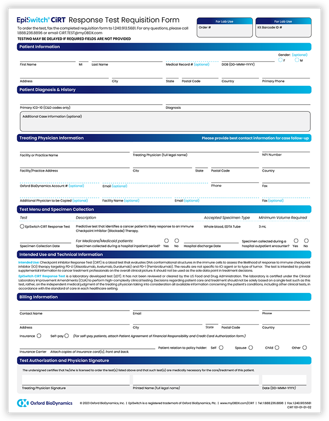 Contact CiRT Customer Service at 888-236-8896 to open an account, request EpiSwitch CiRT Requisition Forms, order EpiSwitch CiRT collection kits, or request further assistance relating to EpiSwitch CiRT. We look forward to speaking with you. If you are in the UK, please contact us at 01865 504932.